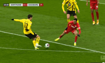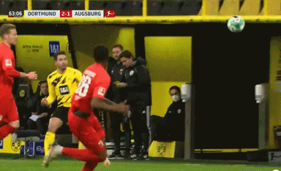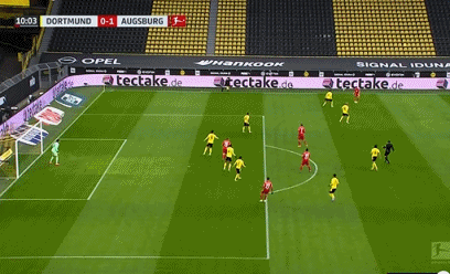 下半场易边再战。第54分钟,桑乔左路底线旁挑传门前,无人防守的雷纳后点球门线前近在咫尺的空门没顶到,罗伊斯右门柱旁小角度抽射被客队后卫挡出底线。第63分钟,格雷罗左路过顶长传,桑乔带球进禁区,小角度推射破门,多特2-1反超比分。