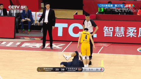 第二节比赛进行到9分20秒的时候,赵睿在高速追防的时候,踩到史鸿飞的脚后崴脚,非常痛苦,被队友架着离场。