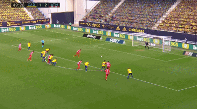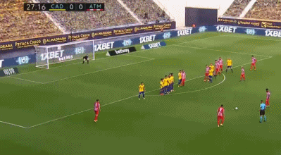 27分钟时,苏亚雷斯用一记对他而言不算常见的任意球破门,帮助马竞首开纪录。在禁区弧顶,乌拉圭人用右脚搓出一记经典弧线球。皮球在飞过人墙头顶之后快速下坠,并飞入了球门左侧死角之中。