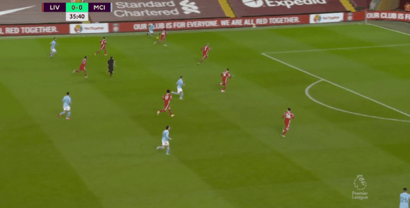 第42分钟,菲尔米诺前场传球,马内接球后杀入禁区后倒地,裁判判罚了大禁区前沿的直接任意球。蒂亚戈直接射门打在人墙上弹出。随后利物浦左侧角球罚入禁区,马内抢到第一落点后头球攻门,皮球被埃德森没收。半场比赛结束,利物浦在主场以0-0的比分暂时战平曼城。