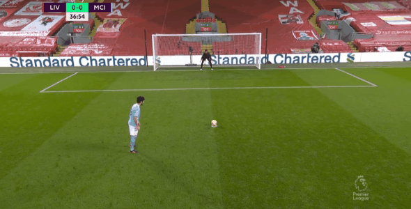 第35分钟,曼城发动快速反击,斯特林左侧带球突破杀入禁区,法比尼奥在其身后伸腿将斯特林放倒,裁判果断判罚点球。12码处,京多安射门高出了球门左上角,曼城错失良机。