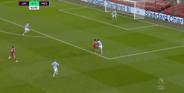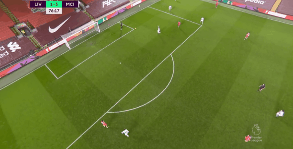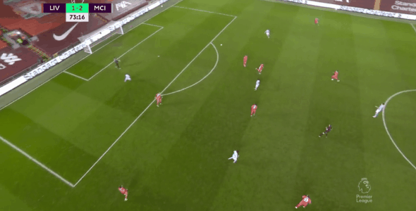 第73分钟,阿利松后场传球失误,福登接球后带球突破,底线附近横传门前,京多安门前轻松推射得手,1-2,曼城反超了比分。