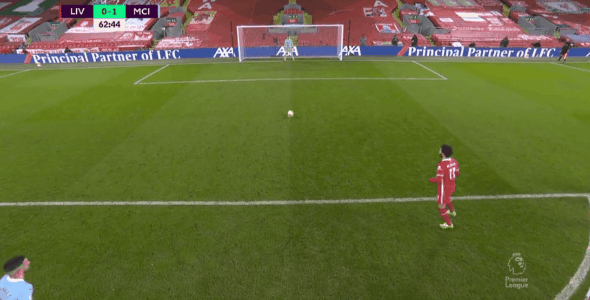 第62分钟,阿诺德后场大范围转移,萨拉赫带球杀入禁区,迪亚斯在身后将其放倒,裁判判罚了点球。12码处,萨拉赫远距离助跑后左脚射门骗过埃德森,皮球应声入网,1-1,利物浦扳平了比分。