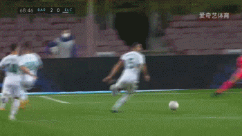 梅西仍然没有射门,他又向前轻趟一步,轻松晃过了劳尔-古蒂。劳尔-古蒂此时已经完全不敢伸脚,否则就是红牌加点球。巴迪亚由于此前已经被骗丢了重心,此时他已经来不及把重心调整回近角了,梅西左脚轻轻一弹把球送入网窝。在极为狭小的空间内,梅西完成了这个看似轻松实则艺术感十足的精彩进球。