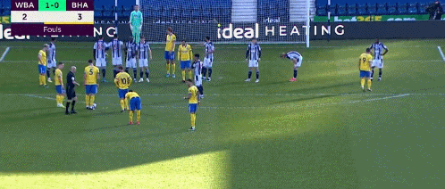一起来看一下布莱顿的这个任意球破门。第28分钟,布莱顿在大禁区弧顶处拿到一个位置不错的任意球,后卫邓克来主罚这个球。在看到西布朗门将约翰斯通仍在指挥队友排人墙的时候,邓克询问主裁梅森是否可以快发任意球。梅森默许,他离开了罚球点,吹响了哨子,示意布莱顿可以发球了。