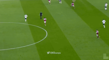 比赛的第10分钟,贝尔回到后场参与防守。对方球员传球失误,贝尔成功把球断下。他先是用一个转身甩开第一名防守球员,并向前推进。此时,第二名防守队员已经到位,站在贝尔的前进路线上。接下来的一幕让热刺球迷血脉喷张——杀得兴起的贝尔没有传球,将球趟起来,然后高速奔跑,强吃防守队员。他成功的突出重围,防守球员在其身后拼了命的追,但还是没有追上……