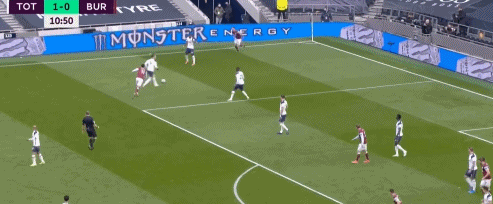 超车成功后,贝尔并没有继续强行向前带,而是将球分给了凯恩,后者又直传给孙兴慜。这时,贝尔并没有闲着,他继续高速向禁区里跑去。孙兴慜再将球传回来,贝尔得球。由于角度太小,他没有射门,选择倒三角回传,但没有和队友连线上。