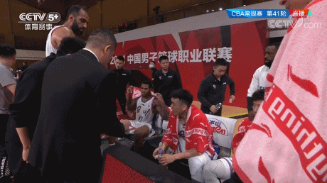 比赛进行到第三节还剩7分17秒,山东队追分势头凶猛,四川叫暂停,一直未获得出场的四川队新外援给拉斯-史密斯给队友韩硕捏肩膀放松。
