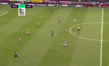 奥巴梅扬没有辜负队友的信任,他轻轻停球后顺势杀到伯恩利禁区,此时两位伯恩利球员奋力过来补位,希望能阻止奥巴梅扬的进攻。而奥巴梅扬在禁区内秀起了脚法,左晃右突后瞬间将对方的防守球员晃开,在看到有射门空间后也不迟疑,立即起右脚射门。
