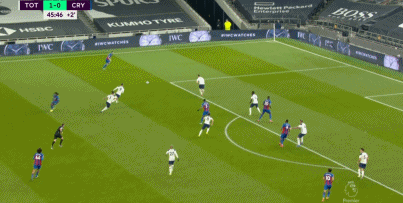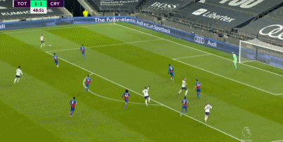 下半场开始,水晶宫换上扎哈。第48分钟,里德瓦尔德飞铲小卢卡斯领到黄牌。第49分钟,贝尔分球,雷吉隆左路传中,后点凯恩头球摆渡,贝尔6码处头球破门,热刺2-1领先。