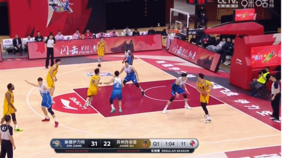 今天中午,CBA常规赛第三节收官战开战,新疆迎战江苏,吴冠希强打周琦得到。