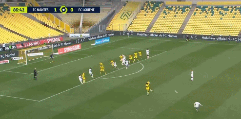 比赛第87分钟,洛里昂赢得一次前场中路的直接任意球机会。但是这次任意球距离球门40米的距离,因此选择直接射门很难得分,大部分情况下,球员都会选择将球吊入禁区,助攻队友。