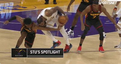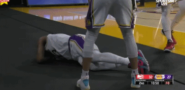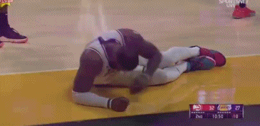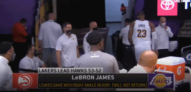 亚特兰大老鹰队和洛杉矶湖人队的比赛第二节,老鹰队前锋所罗门-希尔倒地救球不慎撞到了勒布朗-詹姆斯的脚踝,当时詹姆斯表情痛苦的倒地,硬撑一个回合后很快离场。