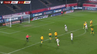 第72分钟,德布劳内斜传禁区右侧,穆尼耶横敲门前被门将扑出,梅尔滕斯上抢被梅菲姆踢倒,主裁判判罚点球,卢卡库主罚点球命中,比利时3-1领先。第88分钟,梅尔滕斯禁区外接德布劳内分球后稍作调整兜射攻门被门将没收。最终比利时3-1战胜威尔士。