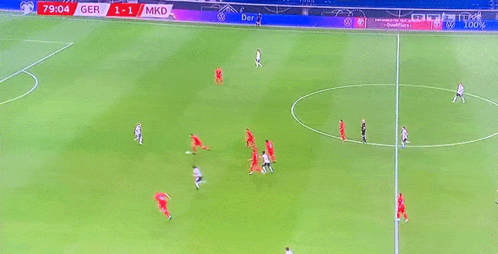 第79分钟,维尔纳本场比赛最“闪耀”的一幕出现了。当时,北马其顿后防线出现重大失误,德国队断球成功并立刻打反击。京多安在左侧带球快速推进,而维尔纳则在中路跟进。到了禁区里,京多安冷静的无私横传,维尔纳在中路无人防守,他的面前几乎是大半个空门。只要轻轻一推皮球,维尔纳就可以帮助德国队反超比分。然而,这位顶级前锋却把球踢呲了,皮球慢慢滚出了底线……