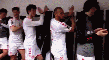 丹麦球员们都站在了自己的更衣柜上,霍伊别尔拆下了垃圾桶盖子。霍伊别尔一边用盖子重击垃圾桶,一边带着队友们一起呐喊和欢呼。