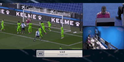 比赛开场第15分钟,主场作战的西班牙人取得梦幻开局,恩巴尔巴开出右侧角球,德托马斯禁区内头球攻门,被门前防守的恩特卡用手挡出。主裁判在观看VAR后将恩特卡直接出示红牌罚下,并判给西班牙人一粒点球,德托马斯亲自主罚点球推射球门左侧得手,1-0!