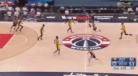 根据NBA官网的数据,威少平均每场给八村塁9.5个传球,助攻1.9次,在全队只有比尔得到了威少更多的传球和助攻。八村塁在有威少在场的时间里,有效命中率是53.1%,威少不在场的时间里,他的有效命中率会降到50%。
