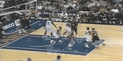 半场奇才最后一攻,眼见第二节等于白打,乔丹也急了。他从三分线外背身单吃刘易斯,在拉到中距离的同时迅速接了个后转身后仰跳投,刘易斯反应慢了一拍乖乖的举起手来却正好又白送上了一分。2+1,随着乔丹的罚球命中,奇才费了老劲才能领先进入下半场。