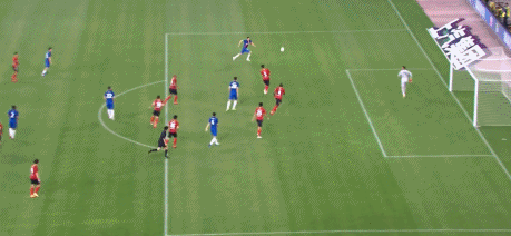 第31分钟,杨旭前场右侧的传中球给到后点,莫雷诺后点头球攻门,石笑天出击击球,没能碰到皮球,一拳击中了莫雷诺头部,奥科雷完成了门线解围,但莫雷诺倒地不起,队医抓紧时间进场处理,随后主裁判吹罚角球。