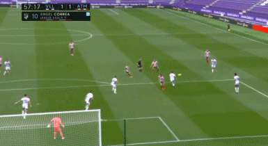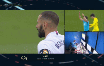 第55分钟,卡塞米罗挑传,本泽马在禁区内头球破门,但VAR判罚本泽马越位进球无效!与此同时马竞比赛,57分钟卡拉斯科分球,科雷亚横带调整并躲过防守球员上抢后来到弧顶推射破门,比分被扳成1-1平!实时积分榜上,马竞领先皇马3分。