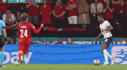 英格兰和丹麦在90分钟内战成1-1平,比赛进入加时赛。第102分钟,斯特林带球突入禁区右侧,两位丹麦球员迈赫勒和延森对他进行包夹防守,斯特林随即摔倒在禁区内,而主裁判吹罚了点球。经过VAR回放后,主裁判维持了点球判罚。之后凯恩主罚点球被扑出,但凯恩补射破门,最终英格兰凭借这个球2-1获胜。