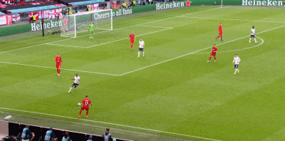 一分钟之后,仍然是萨卡所在的这条右路。传直塞的变成了凯恩,而萨卡的处理球虽然有点慢,但仍然比丹麦这条高大防线的回追快半拍。当横传到来时,克亚尔把斯特林和球一起铲进了门。