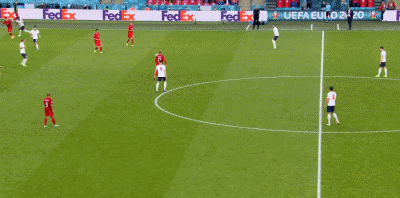 凯恩拉到右路斜传禁区,斯特林差点完成抢点;丹麦转头就打出一波多人参与的快传反推,达姆斯高冲入禁区被凯尔-沃克超车解围。