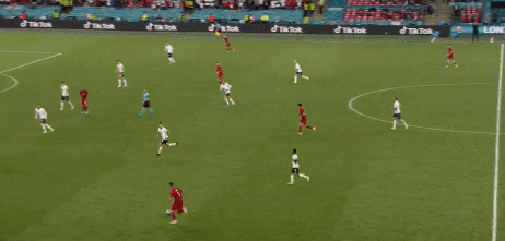 他们继续打着疯狂的高位逼抢,锋线三叉戟上半场加起来有3次成功抢断,而英格兰全队也就只有4次;拦截反击玩命往上堆回合,后腰霍伊比尔一个人再添5次抢断;后防的三高中卫站位也很靠前,赌的是提前解围和拦截长传。