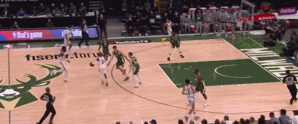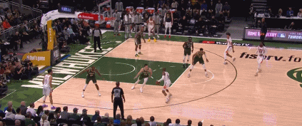 在昨天的分析里我们说过,当字母哥在进攻端没有持球,他到底应该如何参与进攻(详细):他需要作为挡拆掩护者参与,在挡拆之后快速顺下,雄鹿的持球手要头脑清醒做好选择。第二节打了3分钟,雄鹿30比36落后,布登叫出暂停,并且整明白了这一点,好的事情也就开始发生了。接下来的5分钟(字母哥下场休息前),雄鹿打出20比6的高潮,期间几乎每一次进攻,都由字母哥作为挡拆掩护者发起。