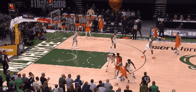 在上一个场景中,雄鹿的多人防守策略也有体现,当保罗运球走底线时,霍勒迪、米德尔顿、洛佩兹三人的注意力全部集中在他的身上。