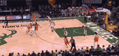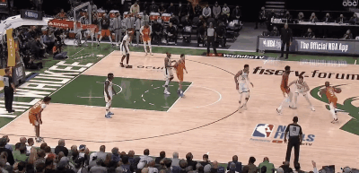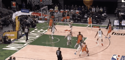 保罗轻松地先康诺顿一步突入禁区,原本和布克对位的米德尔顿见状,直接滑步回收禁区,保罗不知是想给身后的艾顿还是布克,但面对双人防守的压力,他的传球力量不合适,直接被字母哥抢断反击。