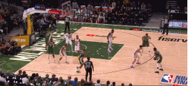 有时候利用好体型、弹力和耐心就够了。艾顿在这一回合就是在后退。等待米德尔顿做出决定,然后残暴地把球拍掉,就好像一个排球运动员。艾顿感知到了自己的后卫队友在绕掩护时没有失去太多位置——这样他就可以更靠近掩护者了。
