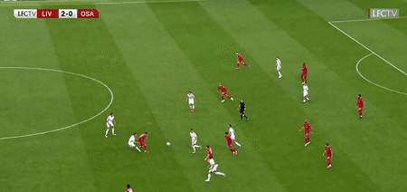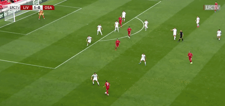 上半场结束前,利物浦几乎锁定了胜局。第41分钟,南野拓实在左路获得空档,他观察了中路队友的跑位后送出传中,这脚斜传的质量很高,准确找到了点球点附近的菲尔米诺,巴西人胸部停球,随后推射破门,利物浦3-0领先。