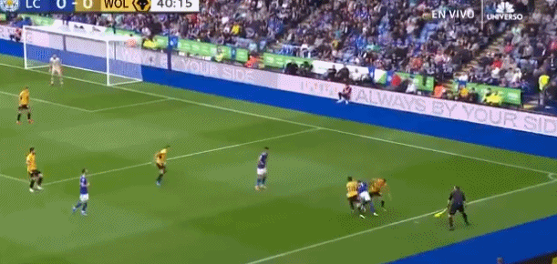 上半场唯一的进球在第40分钟。客队后卫面对阿约泽-佩雷斯的防守球没踢远,身后里卡多-佩雷拉一对二带球突进,右侧底线旁下底传中,前点瓦尔迪轻巧的一脚扫射把球送进网,莱斯特1-0。进球后的瓦尔迪做出了咆哮的独特庆祝。