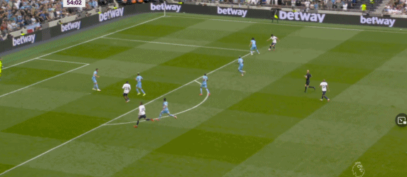 第55分钟,热刺反击,贝尔温传球,孙兴慜右路拿球后内切面对曼城后卫阿克的防守晃出空档后偏右20码处左脚低射,球飞入左下角,热刺1-0领先。