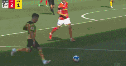 第59分钟,多特蒙德终于扳回一城,2-1。多特蒙德右路踢出了流畅配合,并且送出高质量传中。中路跟进的贝林厄姆勉强起脚打门,皮球被弗莱肯用手挡了一下,但还是钻进了弗赖堡网窝。