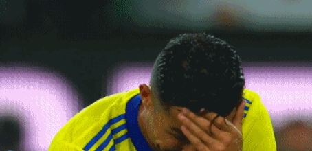 C罗在补时阶段打入“绝杀”进球后疯狂的脱衣庆祝,因此吃到一张黄牌。但是最终进球被吹掉,C罗身上的黄牌却无法“取消”。而面对着进球被吹的现实,C罗低头捂脸,苦笑应对,非常的无奈,或许在感叹他糟糕的运气。
