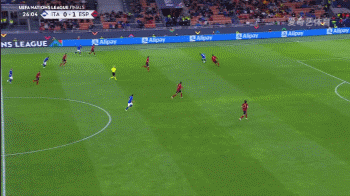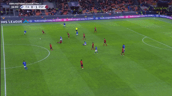 在第27分钟时,维拉蒂在中场左侧加速前插。加维第一时间没有注意到,但很快加速追了上去。加维在全速奔跑40米之后,抢在维拉蒂之前将球捅出了底线。