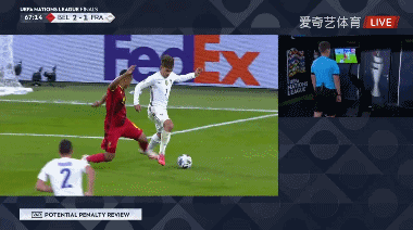 第66分钟,蒂莱曼斯在禁区内踢倒了格列兹曼的脚,后者倒地,主裁在视频裁判的提醒下到场边观看视频回放,最终判罚点球。第69分钟,姆巴佩主罚点球,打球门右上死角,法国扳平比分2-2比利时。