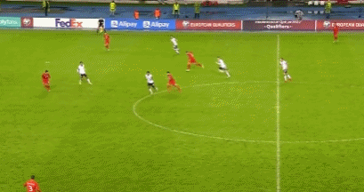 半场补时阶段,哈弗茨左路倒三角回传,穆勒禁区内直塞,维尔纳接球稍作调整,右脚抽射踢在了门柱上。半场结束,德国队客场0-0暂平北马其顿。