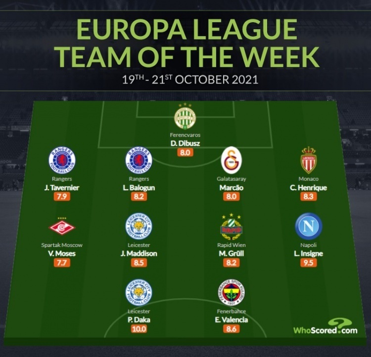 10月22日讯 本周欧联杯已经全部战罢,著名数据网站《WhoScored》评选了本轮欧联杯周最佳阵容,因西涅,达卡领衔。