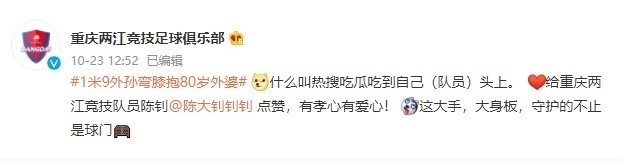 重庆两江竞技官博转发了这个视频表示视频中的男孩正是球队门将陈钊:“给重庆两江竞技队员陈钊点赞,有孝心有爱心!这大手,大身板,守护的不止是球门”