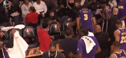 浓眉勾着腰嚷嚷坐在板凳上的霍华德,就像大哥教训小弟。霍华德被喷急了,双手撑着凳子起身(慢慢地),那架势就好像“等我站起来你就等着死吧。”结果霍华德只是顶了句嘴,浓眉却受了什么奇耻大辱似地右手掐住霍华德小臂左手乱挥,仿佛在说“你还敢犟?”待在一旁的隆多和布拉德利发现事态不对,从左侧过来劝架,站在右侧的蒙克则抱住霍华德的左臂。这样一来,霍华德的前后左右不是凳子就是人,这位身高接近2米10体重240斤、在NBA打了18年的36岁老师傅,就像威少在湖人一样失去了施展身手的空间,他顶着一摞紫色小辫扭着肩倒向板凳的样子,就像一个受了委屈的大姑娘,竟让人有些心疼。而浓眉被隔开后依然喋喋不休——毕竟他的保镖也是拉(偏)架人群中的一份子——左手指着瘫倒的霍华德,“你再犟一个试试!”