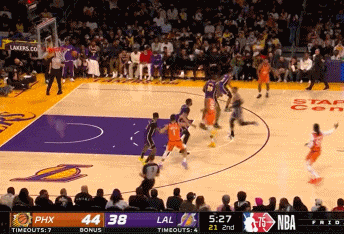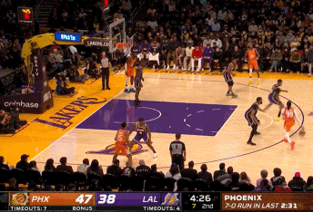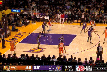 还是艾顿提到弧顶给布克做掩护,但实际上艾顿连防守球员(贝兹莫尔)挂都没挂上,布克直接右路突了,与此同时艾顿拉到了弧顶三分线外。霍华德在干什么呢?他站在肘位,并没有去堵右路几乎已经过掉贝兹莫尔的布克,倒像是在顾及三分线外的艾顿。而浓眉也在罚球线上徘徊,没有回收去补杀到篮下的布克。布克最终抛投命中。