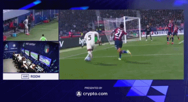 第58分钟,索里亚诺底线拼抢时踩踏巴洛图雷的脚踝,主裁判亲自到场边确认VAR后用红牌直接将索里亚诺罚下,博洛尼亚场上只剩9人。