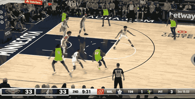 第二节开始后不久英格拉姆和坦普尔各中三分,鹈鹕队以33-30反超。