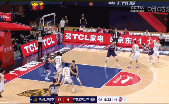 首节比赛打到5分多钟,广厦队以20-4大比分领先,全队三分球9投6中,其中朱俊龙和许可联手包办的5记三分球,全部来自于孙铭徽的助攻。此外,孙铭徽自己也轰进了一记三分远投,他一个人就带动了全队的三分雨。