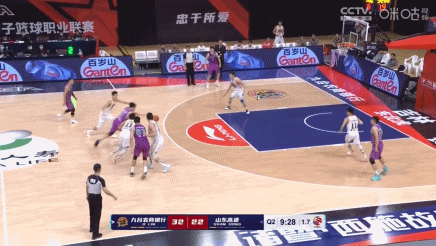 这一球出现在第二节9分25秒,贾诚遭遇包夹停球,面对这种情况,小丁机警跑位到顶弧,贾诚顺势出球。只是小丁在接球时,进攻时间又只剩2秒了,这一次小丁直突篮下,在24秒到时前挑篮命中。