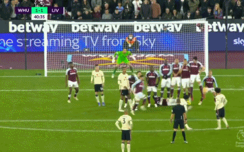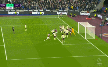 第4分钟,安东尼奥左路突破带球被利物浦的防守球员解围出底线,西汉姆获得角球机会。福纳尔斯左侧角球传中,前点奥邦纳和阿利松撞在一起,福纳尔斯的角球划出一道弧线,阿利松的手挡了一下,但球还是从他头上旋入球门右上角。虽然利物浦球员向主裁抱怨奥邦纳门前有干扰阿利松的嫌疑,但主裁在经过VAR回看后判定进球后效。西汉姆1-0,进球被算作阿利松的乌龙。